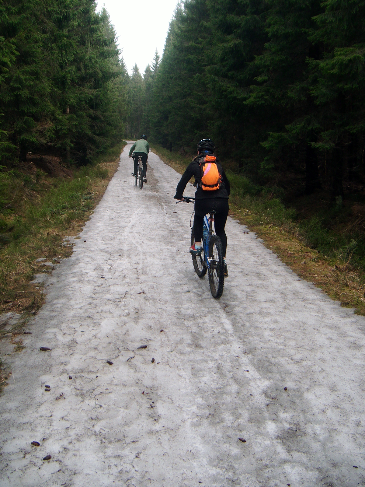 Całkiem sporo się dzisiaj wspinaliśmy, czekał nas zajebisty, długi zjazd, który na mapie miał ambicje być uwieńczeniem tegorocznej majówki. Czasu było mało, drogi nie znaliśmy więc ponownie zrezygnowaliśmy z znajdującej się na wysokości około 1000m n.p.m. kopalni "Stanisław". Zaczął się zjazd...szutrowy, długi, szeroki, nowiutki, gładziutki...bez pedałowania prędkość ustabilizowała się na 33km/h i tak pędziliśmy tracąc mozolnie zbierane przez pól dnia metry n.p.m. Tragedia, było mi żal jak nie wiem co, marnotrawstwo w czystej postaci. Tą przeciętna drogą dojechaliśmy do rozdroża izerskiego. Stamtąd żółtym szlakiem do Kwieciszowic, szeroka leśna drogą, następnie po dojechaniu do cywilizacji już asfaltem.